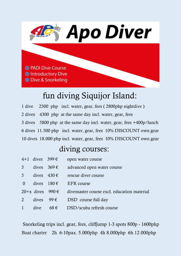 Als Gast bestimmen Sie die Tauchplätze, an denen wir am nächsten Tag tauchen. Wenn Sie kein Taucher sind, können Sie an unseren Ausflügen zum Schnorcheln, Klippenspringen oder Sunset-touren teilnehmen. Wir sind sehr flexibel und bieten auch Ausflüge in die unberührte Natur oder an die geheimen Strände rund um die mystische Insel Siquijor an.